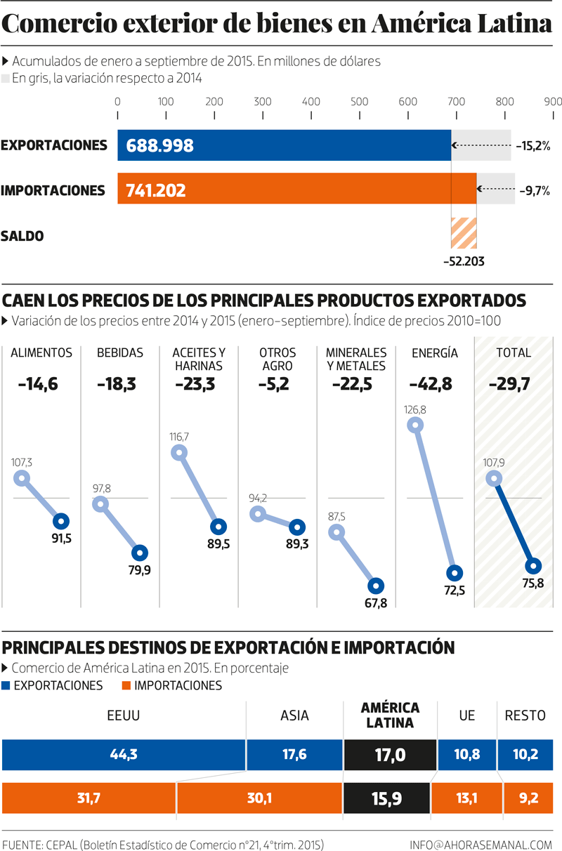 La caída del comercio internacional obedece a causas bien conocidas. Por una parte, los grandes desequilibrios financieros generados en los años 2008 y 2009 no han sido superados en muchos países con gran peso en la economía mundial. Otro hecho notorio es el desplome de la demanda global de materias primas debido a la ralentización de la economía china y el bajo crecimiento que aún persiste en los países de la Unión Europea. Estos factores tuvieron un impacto muy fuerte sobre la evolución de la economía latinoamericana, que, en su conjunto, cerró el año 2015 con un crecimiento negativo (-0,4%).