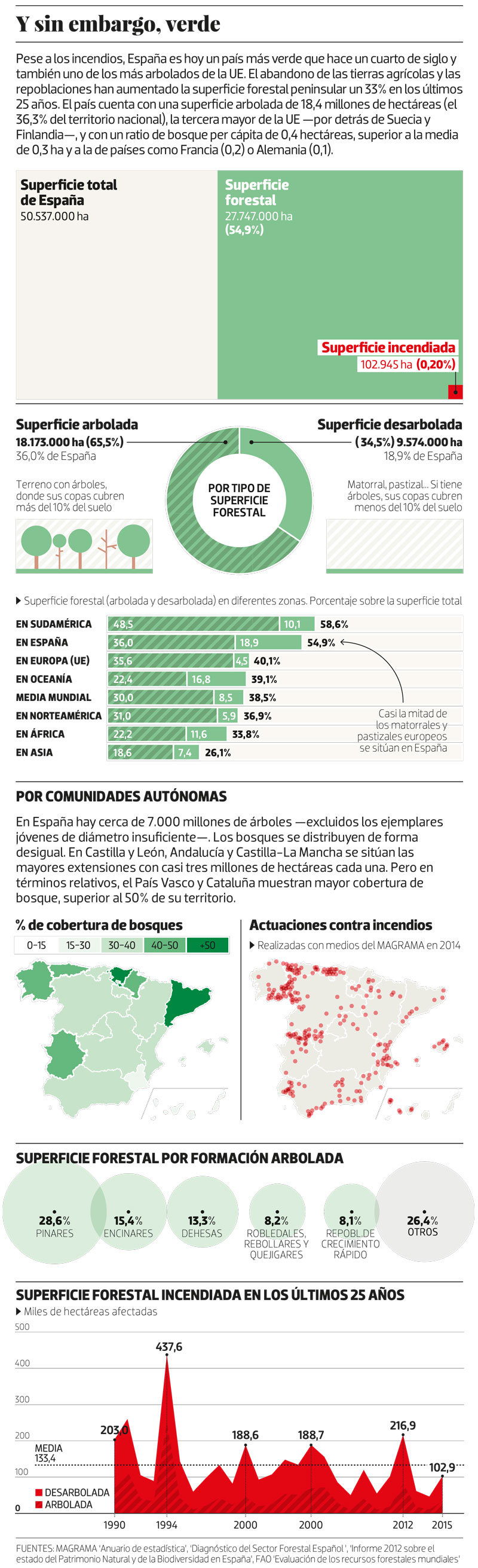 El problema en España no es tanto el fuego en sí, un elemento natural regenerador de la vegetación e imprescindible en ciertos ecosistemas, como la recurrencia de incendios “humanos”, intencionados o causados por negligencias y accidentes —el 95% del total—, y las consecuencias del cambio climático. Entre 2003 y 2013 hubo un promedio de 5.534 incendios forestales al año que afectaron a una superficie media anual de 120.453 hectáreas, aunque en los ejercicios 2014 y 2015 las cifras han sido inferiores. Y con unas condiciones meteorológicas extremas, periodos de sequía más largos y escasez de precipitaciones, nuestros bosques pierden capacidad para reactivarse tras un incendio, lo que se conoce como resiliencia.